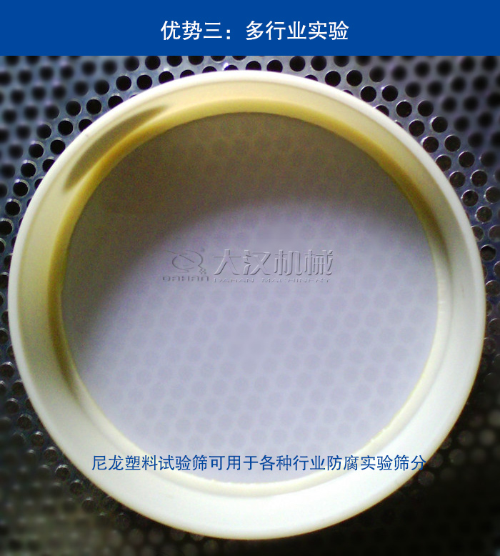 大漢機(jī)械生產(chǎn)的尼龍塑料試驗(yàn)篩廣泛應(yīng)用于食品、醫(yī)藥、化工、磨料、礦山、冶金、地質(zhì)、陶瓷、國(guó)防等行業(yè)的科研單位,實(shí)驗(yàn)室,檢驗(yàn)室,生產(chǎn)控制等的檢驗(yàn)、分析。 在為您精準(zhǔn)檢測(cè)的同時(shí)做到防腐蝕功能。