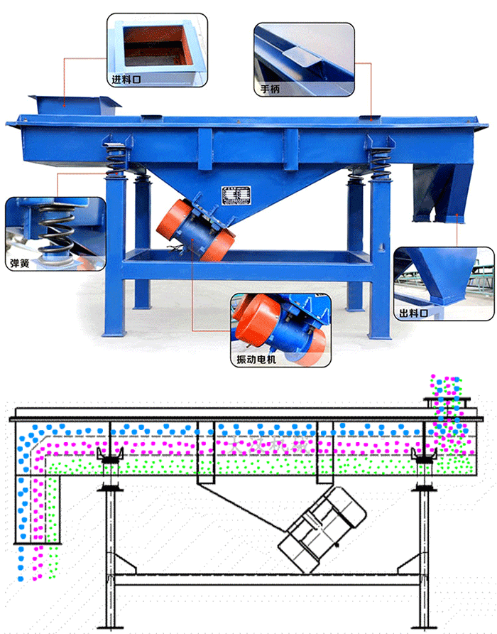 直排篩的原理是通過振動源的作用使物料在篩面做三維運動,這種運動方式可以使結塊物料散開,快速的通過篩網。精細物料直接由下部排出,雜物粗料則通過排渣出料口排出。