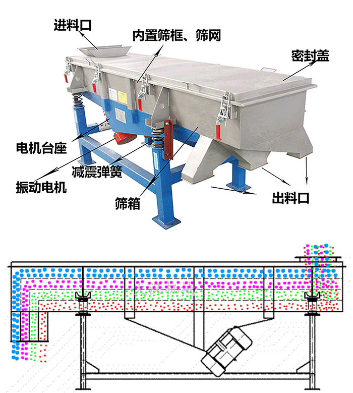 直線篩直線振動篩是一樣的產品其結構可簡單分為:進料口、篩機蓋、篩板、出料口、彈簧和電機。