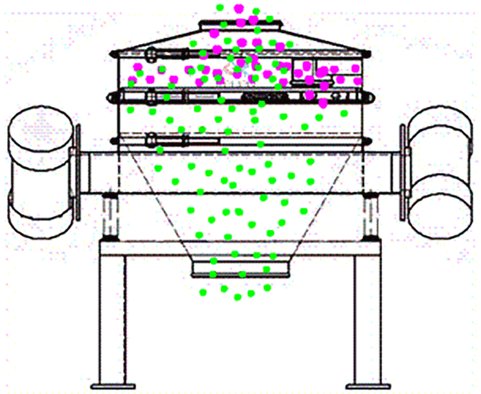 旋振篩是由電機提供振動源,從進料口投入物料,在振動狀態下穿過篩網直到出料口;防塵蓋、束環是為振動篩提供封閉狀態的。