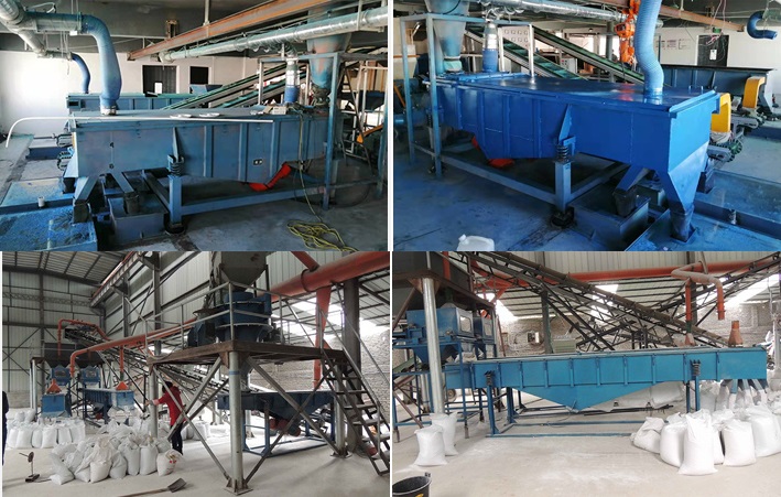 塑料顆粒通過輸送帶進(jìn)入多層直線篩設(shè)備,由于電機激振力和自身重力的雙重作用,塑料顆粒沿直線篩面直線跳躍,上層塑料顆粒在上排料口被篩出,而小于篩網(wǎng)目數(shù)的塑料顆粒進(jìn)入下部篩網(wǎng),仍沿同一物料運動軌跡。經(jīng)過三層篩網(wǎng)后,塑料顆粒分為大于2.5mm塑料顆粒、2.5mm-1.4mm塑料顆粒、1.4mm-80目塑料顆粒、小于80目塑料顆粒等四種規(guī)格的材料,還可根據(jù)要求選擇6層不通目數(shù)的篩網(wǎng),以實現(xiàn)要求的分級效果。
